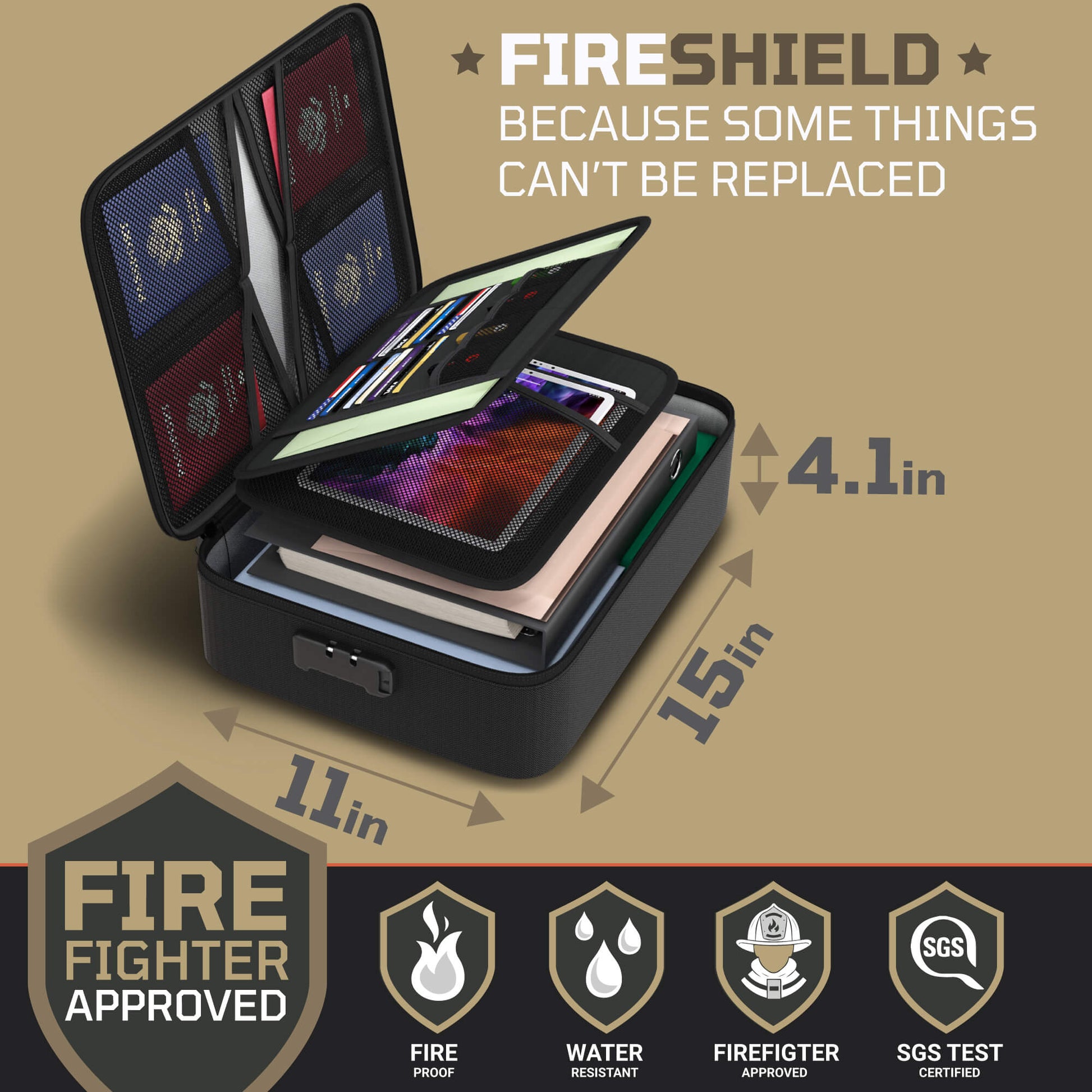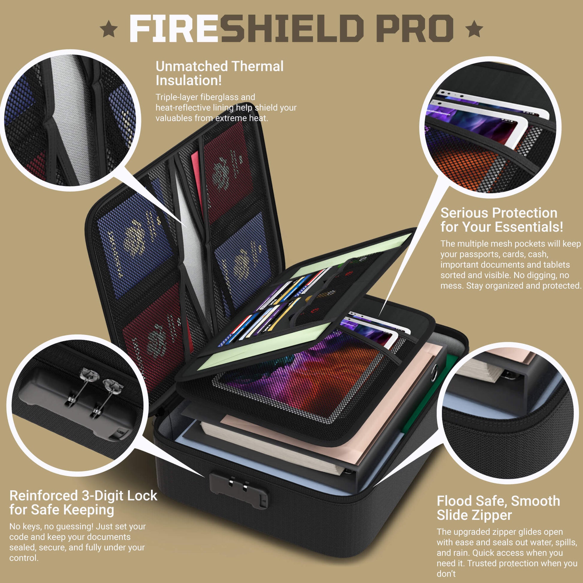 - BUILT FOR THE MOMENTS YOU CAN’T PREDICT – Fires, floods, accidents—life doesn’t come with a warning. That’s why the FIRESHIELD PRO document bag is crafted with triple-layered, silicone-coated fiberglass. It’s fireproof, built to handle extreme heat and with a water resistant exterior that shields your documents, electronics, and valuables from fire sprinklers, rain, and unexpected spills. Whether it’s packed in your luggage or tucked away at home, your essentials stay protected—right where you packed them.