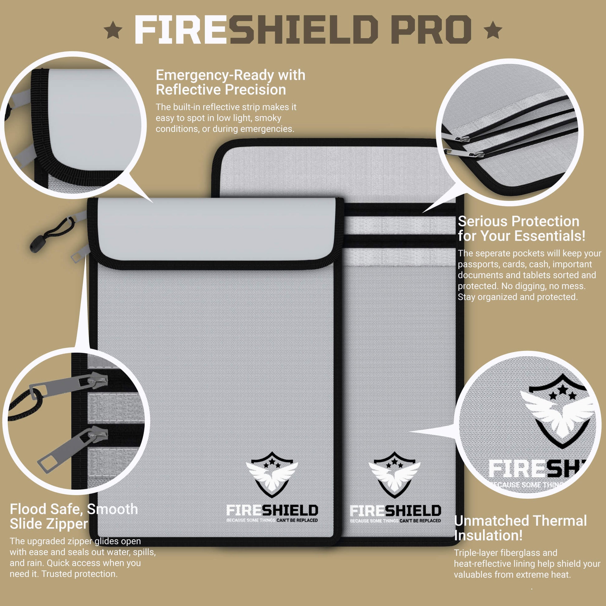 - TWO POCKETS. ONE PLACE FOR EVERYTHING – You shouldn’t have to choose between your passport, cash, or documents. With dual-layered compartments and a smooth-glide zipper, the FIRESHIELD PRO keeps your valuables organized, secure, and separated. Carry family records, emergency contacts, birth certificates, and backup drives, without digging or doubling up. No clutter. No panic. Easy to grab when it matters most.